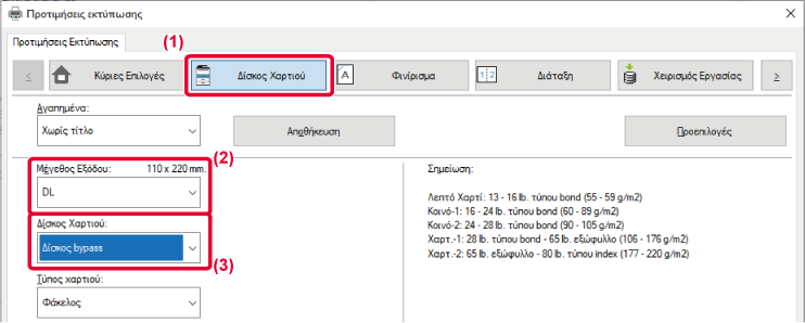 το μέγεθος και τον τύπο χαρτιού για εκτύπωση καθώς και το δίσκο
