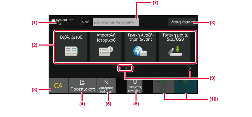Σε αυτή την ενότητα περιγράφονται τα πλήκτρα σε μια βασική οθόνη, λαμβάνοντας ως παράδειγμα τη βασική οθόνη E-mail. Διατίθενται διάφορες μέθοδοι στη λειτουργία Αποστολής Εικόνας, συμπεριλαμβανομένων της Σάρωσης σε E-mail και της Σάρωσης σε FTP. Η διάταξη της βασικής οθόνης παρουσιάζει μικρές διαφορές, ανάλογα με τον τρόπο αποστολής της εικόνας.
