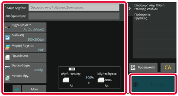 Τοποθετήστε το πρωτότυπο στον δίσκο του αυτόματου τροφοδότη πρωτοτύπων ή στο κρύσταλλο πρωτοτύπων.Ελέγξτε το όνομα του αρχείου και το σημείο αποθήκευσης και πιέστε τα πλήκτρα για τυχόν ρυθμίσεις που θέλετε να επιλέξετε.