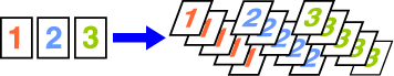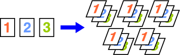 Permet d'obtenir des jeux de pages assemblés (1 2 3, 1 2 3, ...). Exemple : Lorsque le nombre de copies est défini sur 5 pour le tri ![]() |