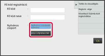 A kód javításáról az " ÚJ SZÁMLAKÓD REGISZTRÁLÁSA" című rész 4–7. lépésében talál információt.A műveleti panelen koppintson az [Regisztr. vége] gombra.