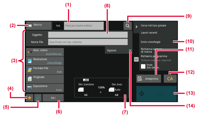 Questa sezione descrive gli elementi chiavi di una schermata di base, prendendo come esempio la schermata di base E-mail. Nella modalità Invio Immagine sono disponibili diversi metodi, inclusi Scansione a e-mail e Scansione su FTP. Il layout della schermata di base presenta alcune differenze a seconda del modo in cui viene inviata l'immagine.