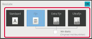 Selecteer deze instelling wanneer uw originelen kleine letters of diagrammen met dunne lijnen bevatten. Het origineel wordt gescand met een resolutie die tweemaal zo hoog is als de instelling [Standaard]. |