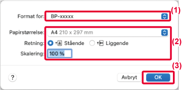 angitt under "Papirstørrelse" på skjermbildet for utskriftsformat, brukes til