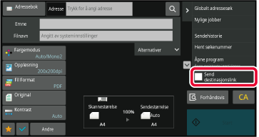 [Send destinasjonslink] vises på handlingspanelet på hovedskjermen i Skanne til e-post. Merk av i avmerkingsboksen ( ) for å bruke denne funksjonen.