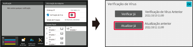 A atualização será cancelada e o painel tátil irá mostrar que o ficheiro atualizado está danificado. Após o utilizador confirmar o conteúdo e fechar o ecrã, a máquina irá funcionar com o firmware antes da atualização. Se o firmware foi atualizado remotamente, a atualização será cancelada e a informação de deteção de vírus será exibida na "Notificação" do ecrã de Informações do Sistema. A máquina irá funcionar com o firmware antes da atualização |