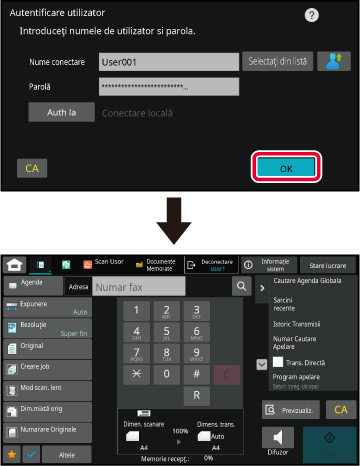 Dacă numele de conectare şi parola sunt autentificate, se afişează numărul de pagini rămase pe care utilizatorul le poate copia sau scana.