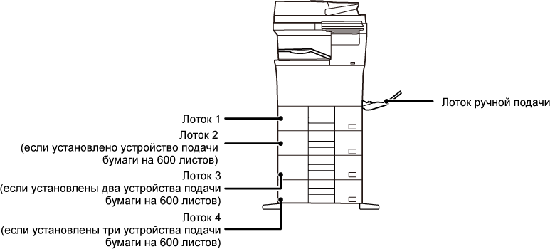 * Если обычно используется переработанная бумага, бумага с перфорацией, формы, бланки, цветная бумага или бумага пользовательских типов 1–7, установите соответствующую плотность бумаги в "Установки” – [Системные Параметры настройки] → [Общие Параметры настройки] → [Настройки Бумаги] → [Параметры лотка для бумаги] → [Плотность].