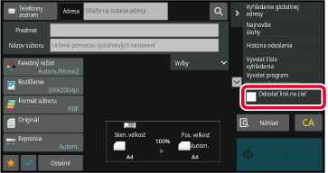 • Nastavenie konfigurujte v ponuke "Nastavenia (administrátor)" → [Nastavenia systému] → [Nastavenia odoslania obrázkov] → [Nastavenia skenovania] → [Nastavenia stavu] → [Povoliť odoslanie prepojenia na cieľ ako predvolené]. Keď je táto funkcia povolená a e-mail sa odosiela v normálnom režime, políčko [Odoslať prepojenie na cieľ] na paneli akcií je vždy začiarknuté na možnosť .