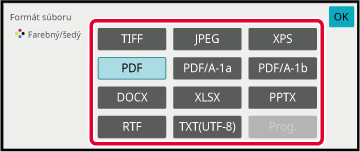 *1 Ak ako formát súboru vyberiete možnosť PDF (vrátane šifrovaného a s vysokou komprimáciou), môžete použitím komprimovania Flate zmenšiť veľkosť súboru.