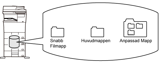 När kopiering, bildsändning eller andra jobb utförs sparar den här funktionen dokumentdata till den lokala enheten. Olika typer av information kan läggas till i filen när den sparas för att möjliggöra effektiv filhantering, i motsats till funktionen Snabbfil. Det går även att ange ett lösenord. |