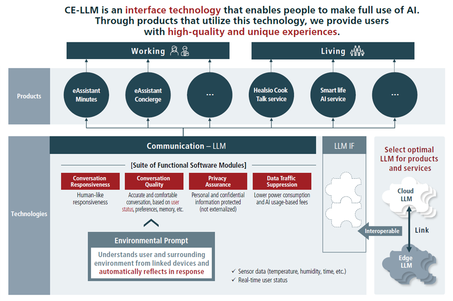 In the rapidly evolving field of AI, Sharp focuses on strengthening the development of our proprietary edge AI technology, CE-LLM. CE-LLM features an Environmental Prompt, which automatically inputs information on a user’s surrounding environment into AI in real time, and optimized switching between edge AI and cloud AI. These features not only enhance conversation responsiveness and quality but also assures privacy and reduced data traffic. Sharp will leverage CE-LLM to provide new people-oriented AI solutions.