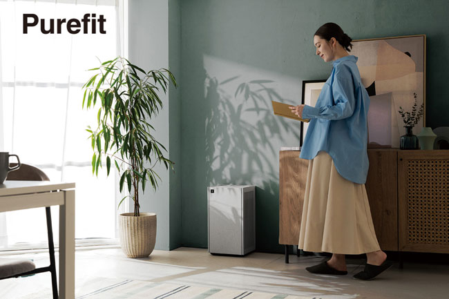 The latest model in the Purefit series of Plasmacluster air purifiers which combine operating noise, size, and air purification performance to “fit” various scenes, it expresses premium quality with horizontal and vertical silhouette lines inspired by a furniture. It was designed to harmonize with room interiors while functioning as a home appliance. From a functional perspective, this product incorporates a W-Filter structure which achieves high airflow with low noise and compact installation. It also features Sharp’s proprietary high-concentration Plasmacluster 25000 technology. With a focus on sound, size, and purification performance, it offers an environment where everyone can relax and enjoy their time at home.